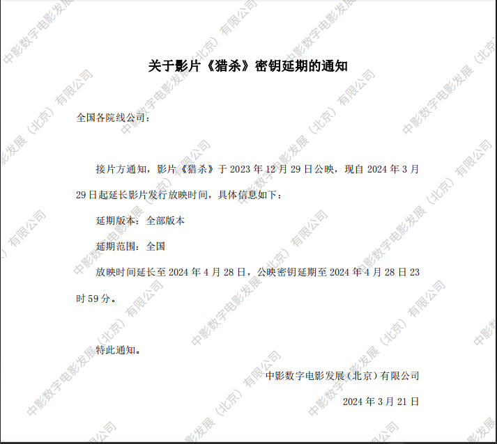 关于影片《猎杀》第八次密钥延期的通知