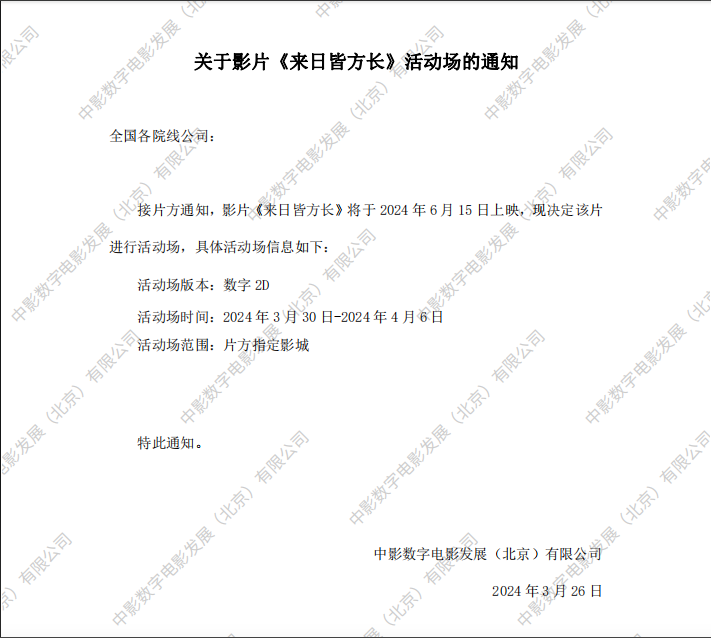 《来日皆方长》发行范围变更的通知