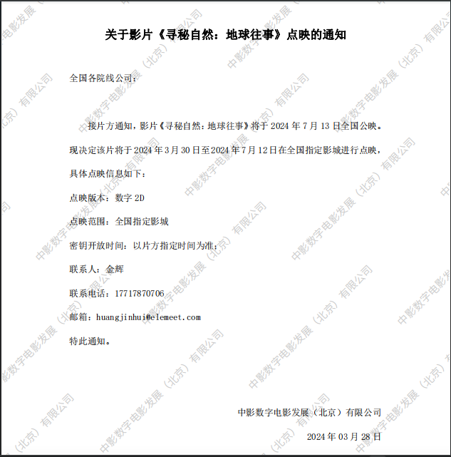 《寻秘自然:地球往事》调整票房结算标准的通知
