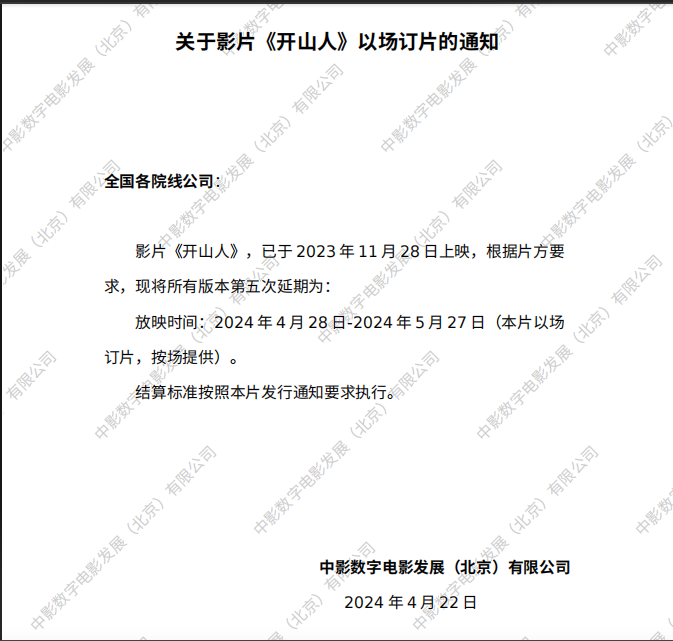 《开山人》第八次以场订片的通知