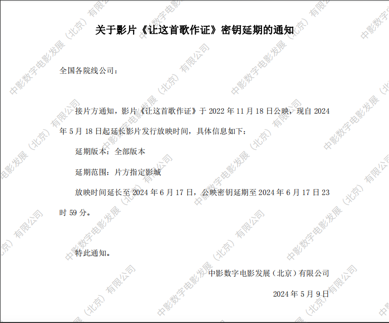 《让这首歌作证》第十五次密钥延期的通知