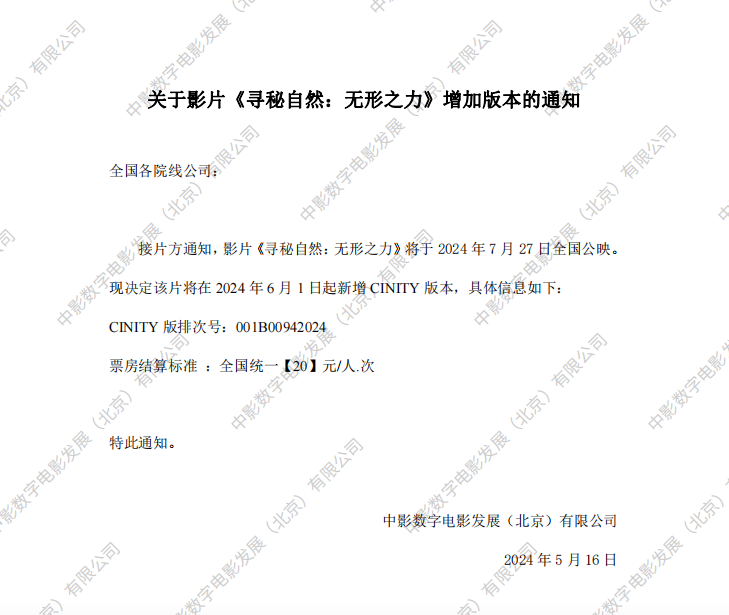 《寻秘自然:无形之力》调整票房结算标准的通知
