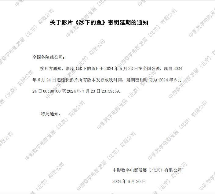 关于影片《冰下的鱼》二次密钥延期的通知