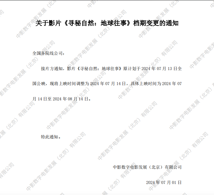 《寻秘自然:地球往事》调整票房结算标准的通知