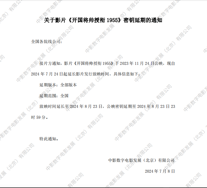 《开国将帅授衔1955》第十一次密钥延期的通知