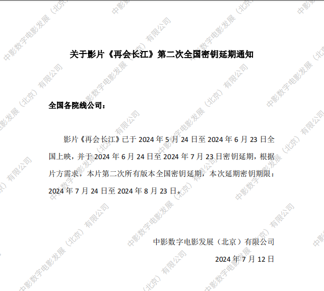 《再会长江》全国密钥延期的通知