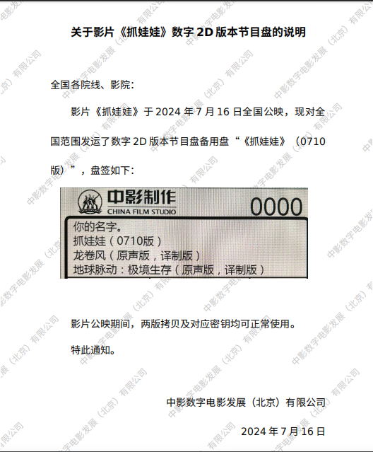 《抓娃娃》提档的通知