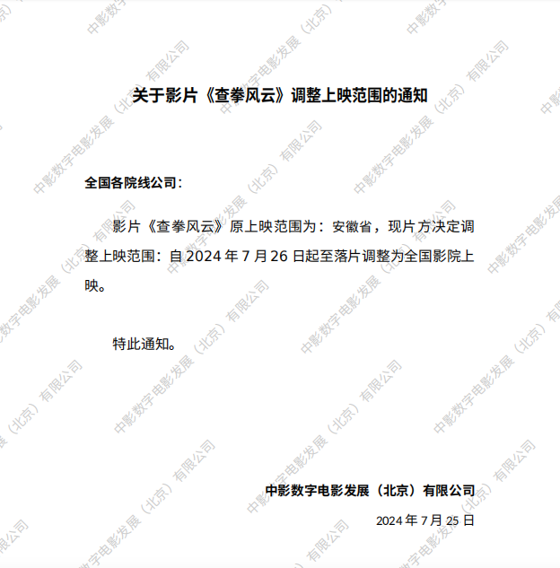 发行通知 » 《查拳风云》调整上映范围的通知