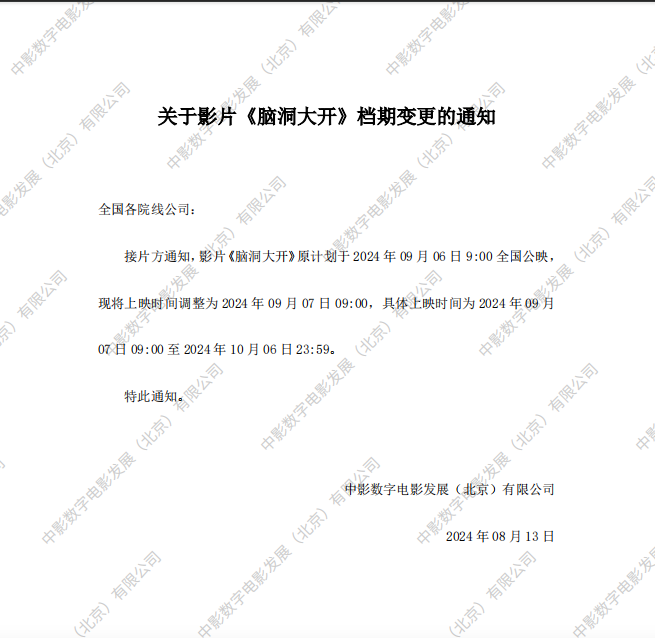 关于影片《脑洞大开》档期变更及全国点映的通知