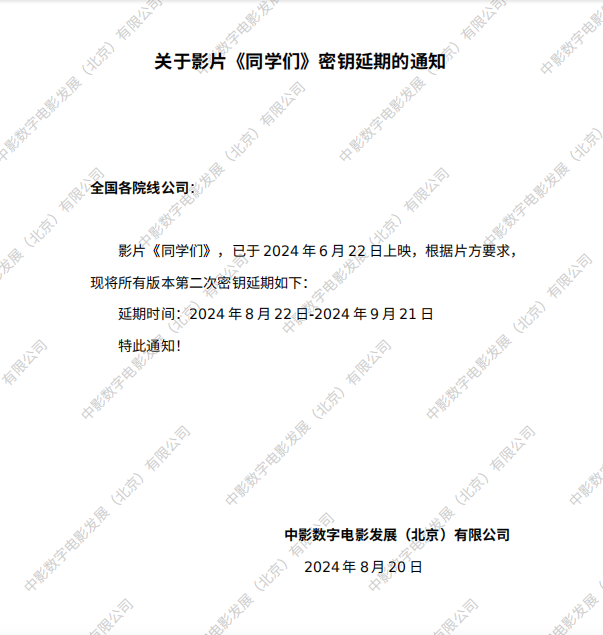 关于影片《同学们》第三次密钥延期的通知