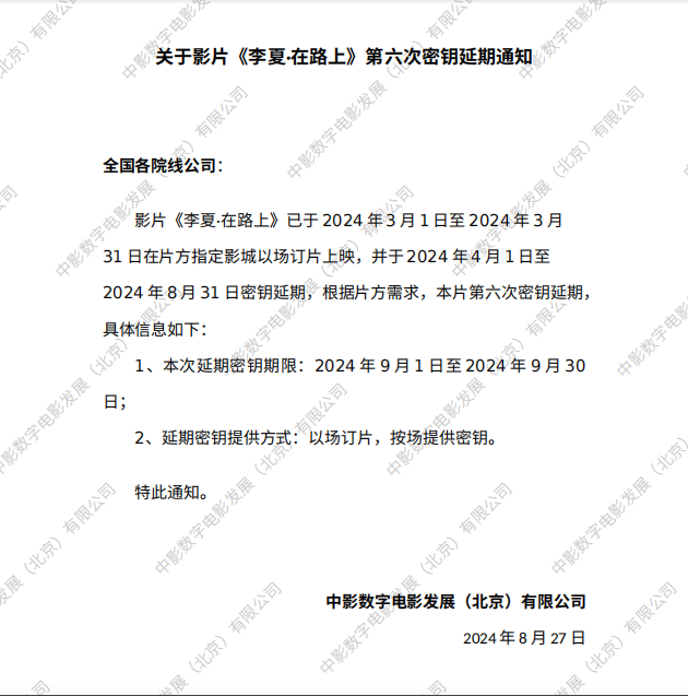 关于影片《李夏·在路上》第五次密钥延期通知.