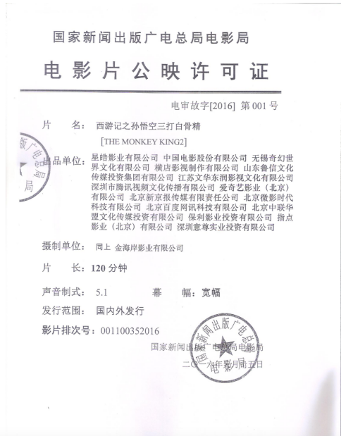 联合出品:中国电影股份有限公司 ;无锡奇幻世界文化有限公司;横店影视制作有限公司;山东鲁信文化传媒投资集团有限公司;江苏文华东润影视文化有限公司;深圳市腾讯视频文化传播有限公司;爱奇艺影业(北京)有限公司;北京新京报传媒有限责任公司;北京微影时代科技有限公司;北京百度网讯科技有限公司;北京中联华盟文化传媒投资有限公司;保利影业投资有限公司;指点影业(北京)有限公司 ;深圳意尊实业投资有限公司