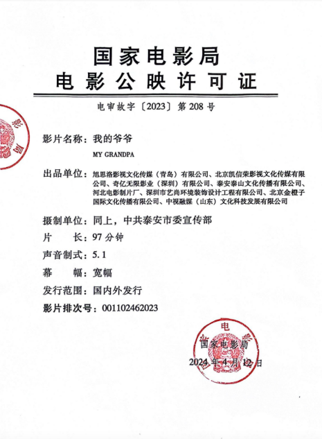 联合出品:泰安泰山文化传播有限公司、河北电影制片厂、深 圳市艺尚环境装饰设计工程有限公司、北京金橙子国际文化传播有限公司、中视融媒 (山东)文化科技发展有限公司