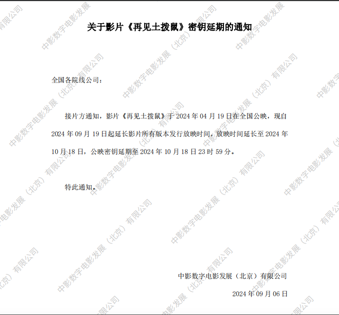《再见土拨鼠》调整票房结算标准的通知