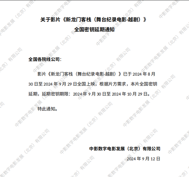 《新龙门客栈(舞台纪录电影·越剧)》第九次全国密钥延期的通知
