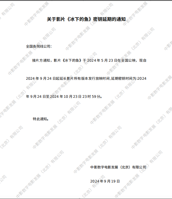 关于影片《冰下的鱼》二次密钥延期的通知