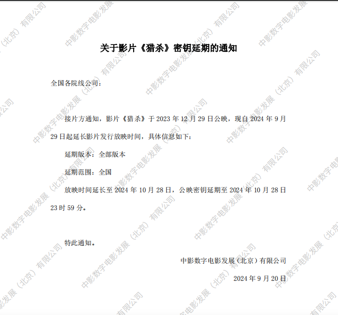 关于影片《猎杀》第八次密钥延期的通知