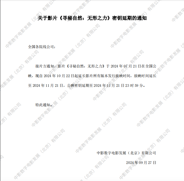 《寻秘自然:无形之力》调整票房结算标准的通知