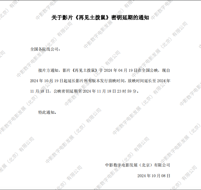《再见土拨鼠》调整票房结算标准的通知