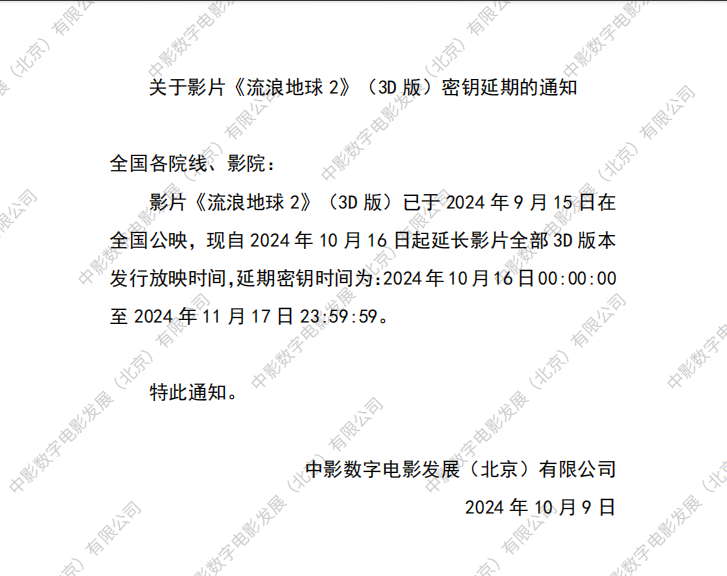 《流浪地球2》(3D版)第二次密钥延期的通知