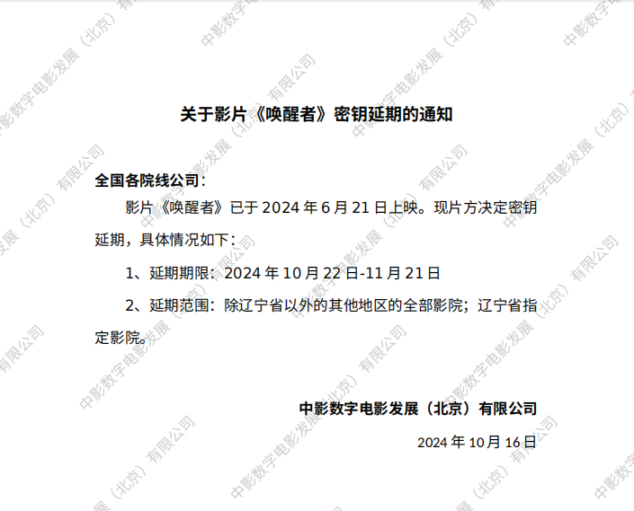 关于影片《唤醒者》密钥延期的通知