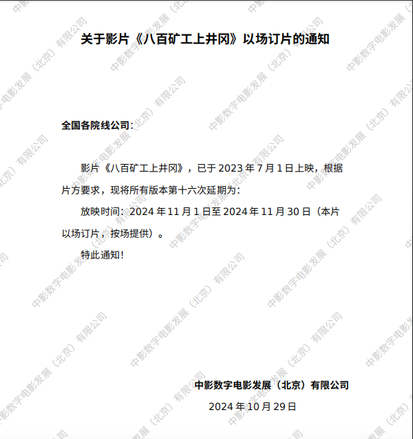 发行通知 » 《八百旷工上井冈》第十六次以场订片的通知