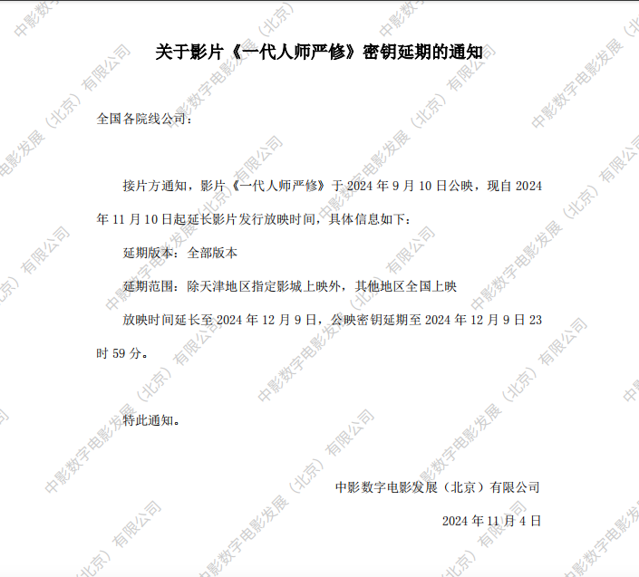 《一代人师严修》第三次密钥延期的通知