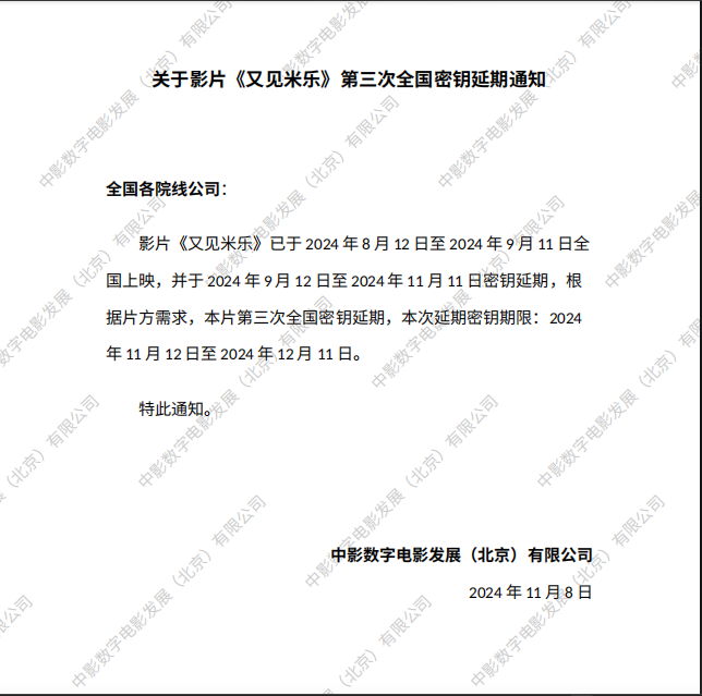 关于影片《又见米乐》第二次全国密钥延期通知