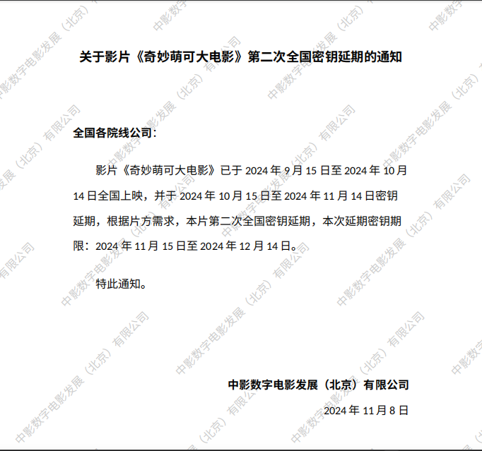 《奇妙萌可大电影》全国密钥延期及调整票房结算标准的通知