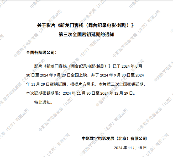 《新龙门客栈(舞台纪录电影·越剧)》第十一次全国密钥延期的通知