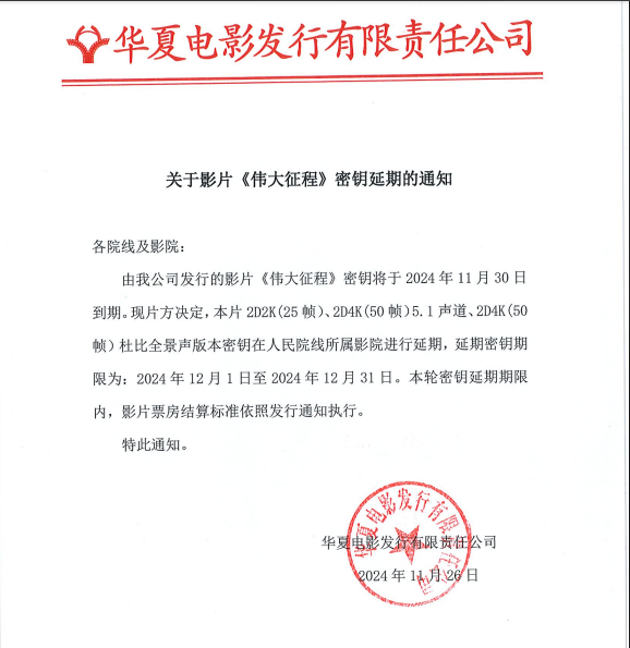 影片《伟大征程》第七轮密钥延期的通知