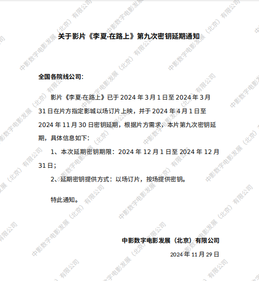 关于影片《李夏·在路上》第五次密钥延期通知.
