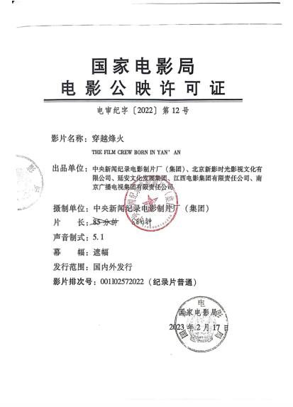 联合出品:北京新影时光影视文化有限公司、延安文化发展集团、江西电影集团有限责任公司、南京广播电视集团有限责任公司