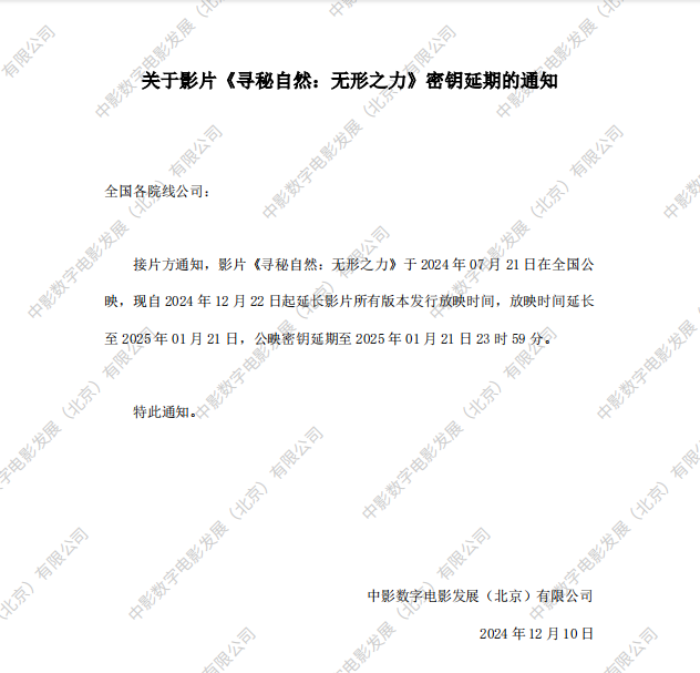《寻秘自然:无形之力》调整票房结算标准的通知
