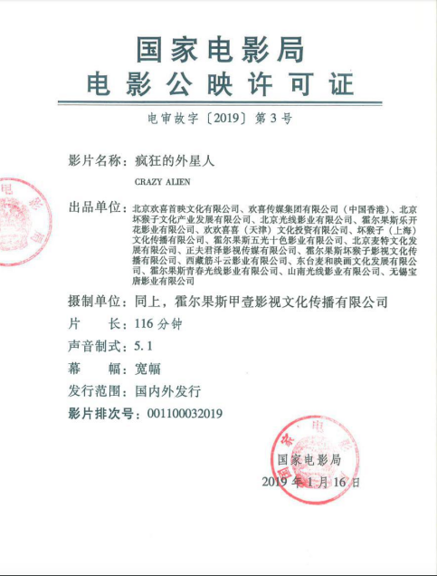 出 品:北京欢喜首映文化有限公司、欢喜传媒集团有限公司(中国香港)、北京坏猴子文化产业发展有限公司、北京光线影业有限公司、霍尔果斯乐开花影业有限公司、欢欢喜喜(天津)文化投资有限公司、坏猴子(上海)文化传播有限公司、霍尔果斯五光十色影业有限公司、北京麦特文化发展有限公司、正夫君泽影视传媒有限公司、霍尔果斯坏猴子影视文化传播有限公司、西藏筋斗云影业有限公司、东台麦和映画文化发展有限公司、霍尔果斯青春光线影业有限公司、山南光线影业有限公司、无锡宝唐影业有限公司