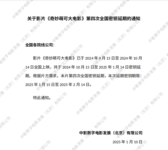 《奇妙萌可大电影》全国密钥延期及调整票房结算标准的通知