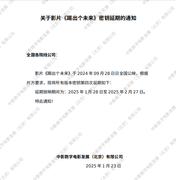 关于影片《踢出个未来》第八次密钥延期的通知