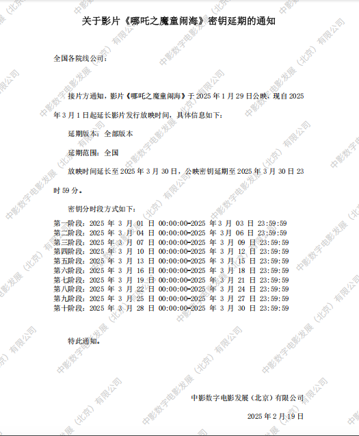 《哪吒之魔童闹海》第二次密钥延期的通知
