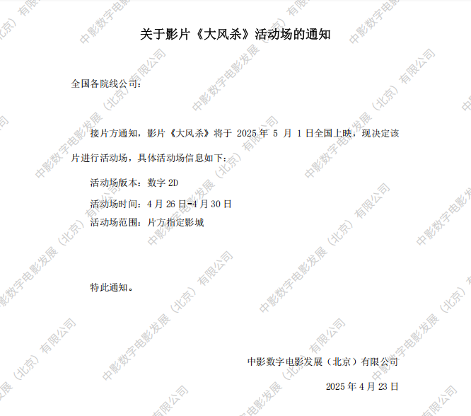 关于影片《大风杀》密钥延期及发行范围变更通知