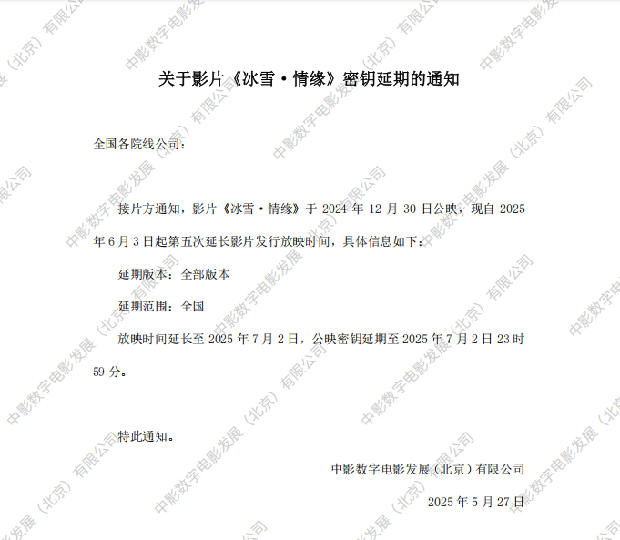 关于影片《冰雪·情缘》第八次密钥延期的通知