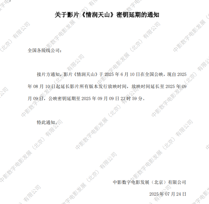 发行通知 » 关于影片《情润天山》2次密钥延期的通知