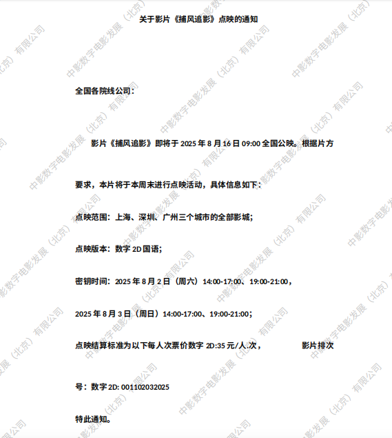 《捕风追影》调整票房结算标准的通知