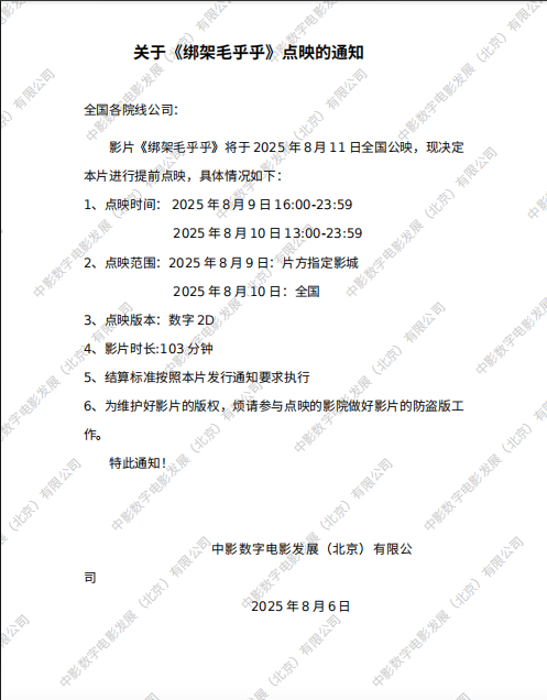 《绑架毛乎乎》档期调整及结算标准变更的通知