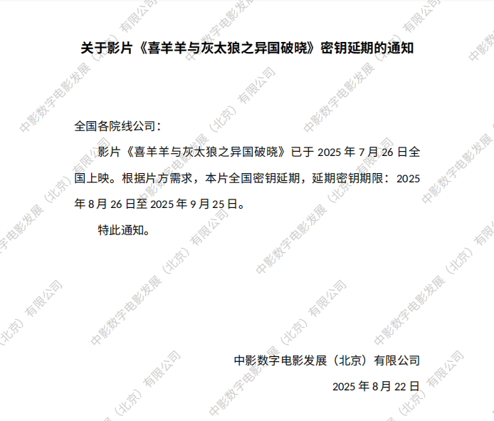 《喜羊羊与灰太狼之异国破晓》密钥延期的通知