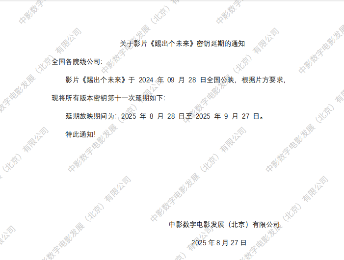 关于影片《踢出个未来》第八次密钥延期的通知