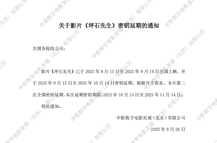 《坪石先生》第五次全国密钥延期及调整票房结算标准的通知