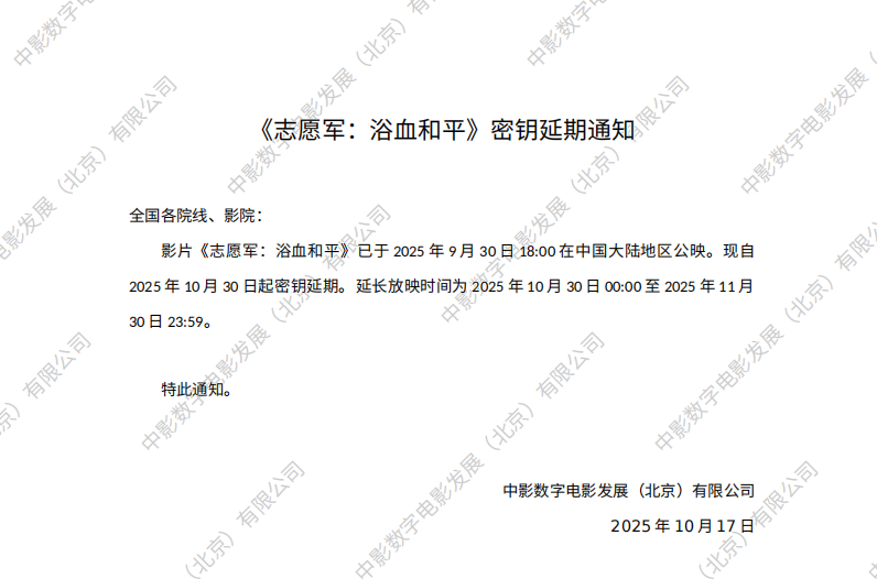 关于影片《志愿军:浴血和平》调整结算标准的通知