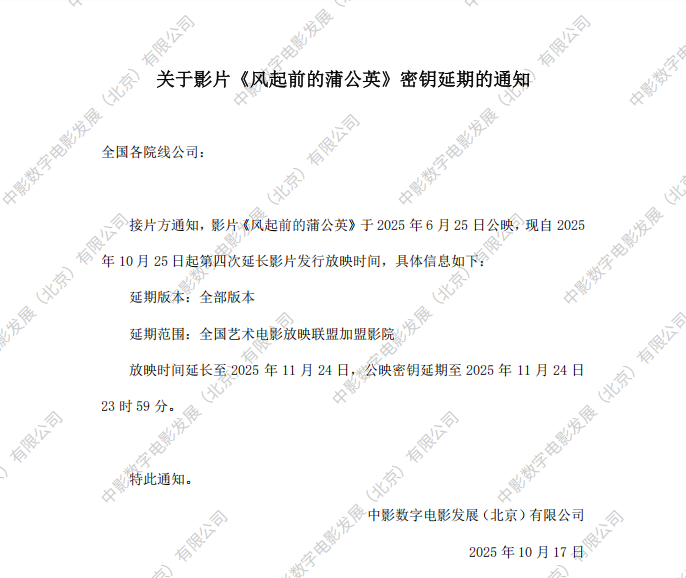 关于影片《风起前的蒲公英》第二次密钥延期的通知