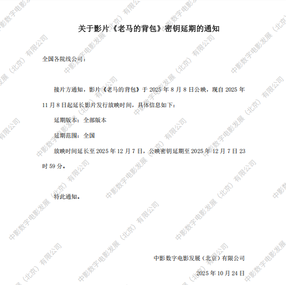 关于影片《老马的背包》第五次密钥延期的通知