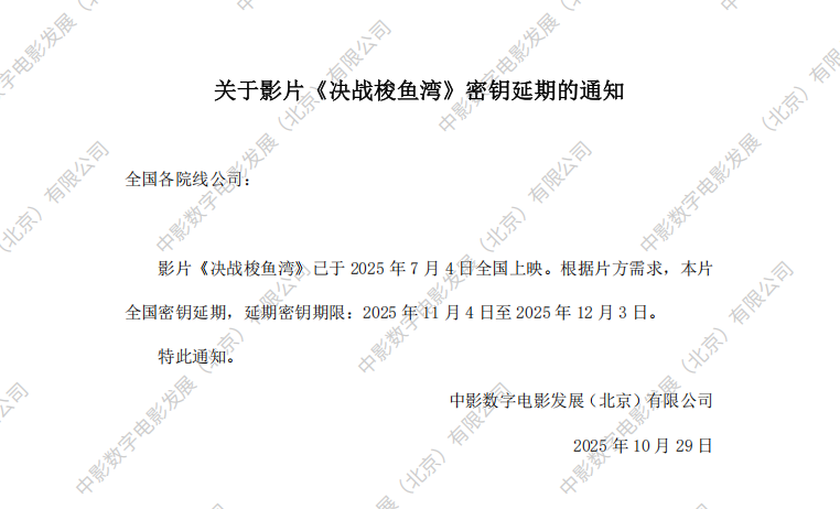 关于影片《决战梭鱼湾》第二次全国密钥延期通知